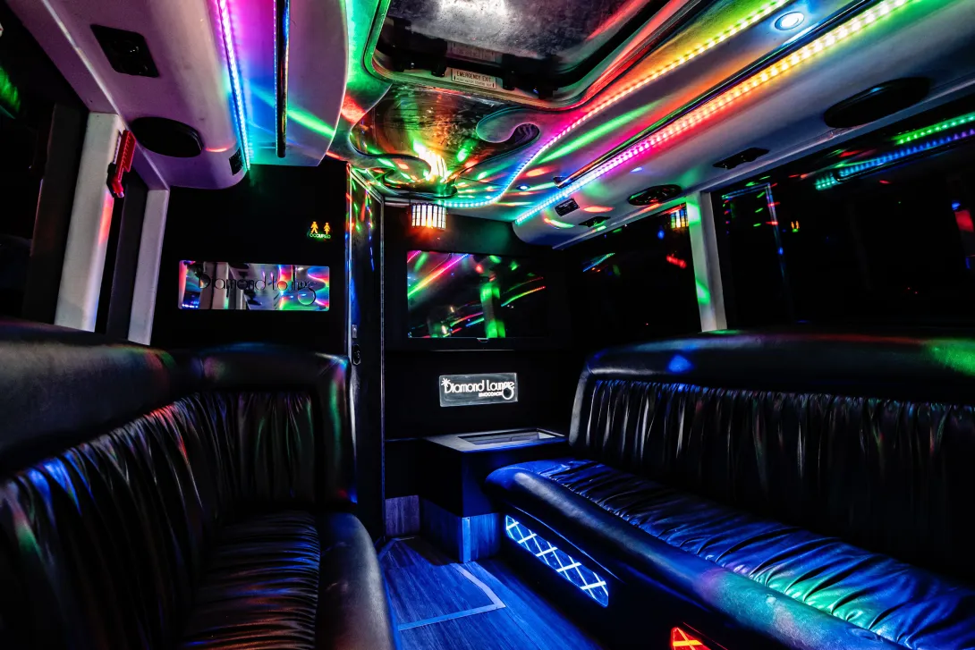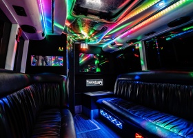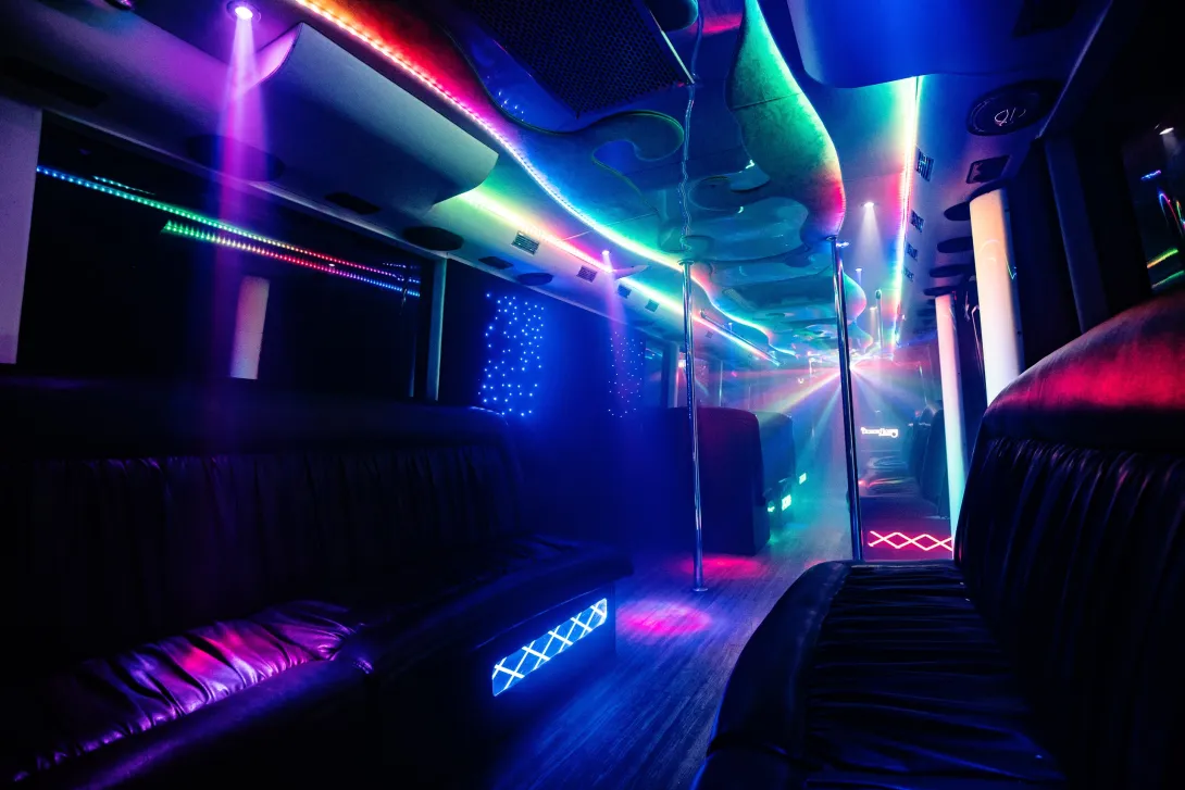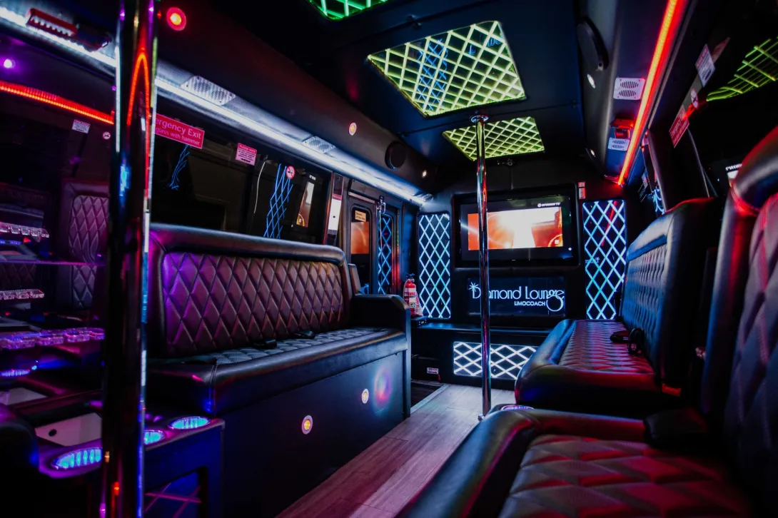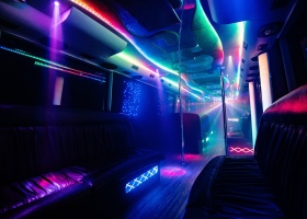 With floor to ceiling ambience lighting, air- conditioning, smoke machines, lasers, Dance floor and pole, bar - The Ultimate Limo.